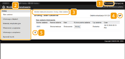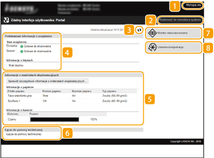 Wyświetla bieżący stan urządzenia i informacje o błędach. W przypadku wystąpienia błędu wyświetlana jest strona Informacje o błędzie.