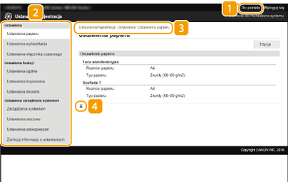 Wyświetla stronę [Ustawienia/rejestracja]. Po zalogowaniu się w trybie menedżera systemu można zmienić elementy ustawień i zapisać lub załadować zarejestrowane dane.