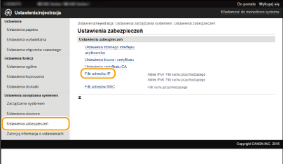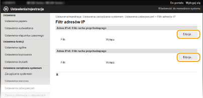 Nieprawidłowo wprowadzone adresy IP mogą uniemożliwić dostęp do urządzenia z poziomu Zdalnego interfejsu użytkownika. Konieczne będzie wtedy ustawienie filtra <Filtr adresów IPv4> lub <Filtr adresów IPv6> na wartość <Wyłącz>. Filtr adresów IPv4 Filtr adresów IPv6