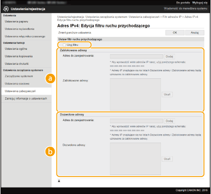 Umożliwia komunikację (odbiór) tylko z urządzeniami o adresach IP zapisanych w polu [Dozwolone adresy], a ogranicza komunikację z urządzeniami o innych adresach IP. Niemniej jednak komunikacja jest ograniczona w przypadku adresów IP zarejestrowanych również w polu [Zablokowane adresy].