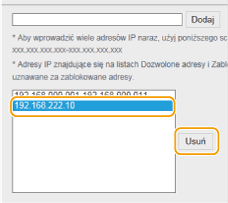 Ogranicza komunikację (odbiór) z urządzeniami o adresach IP wprowadzonych w polu [Adres do zarejestrowania]. Komunikacja z urządzeniami o innych adresach IP jest dozwolona.