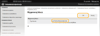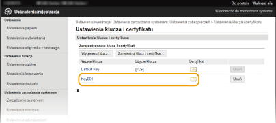 Nie można usunąć pary kluczy, która jest obecnie używana do innych celów, np. gdy element „[TLS]” lub „[IEEE 802.1X]” jest wyświetlany w pozycji [Użycie klucza]. W takiej sytuacji należy wyłączyć daną funkcję lub zamienić parę kluczy przed jej usunięciem.