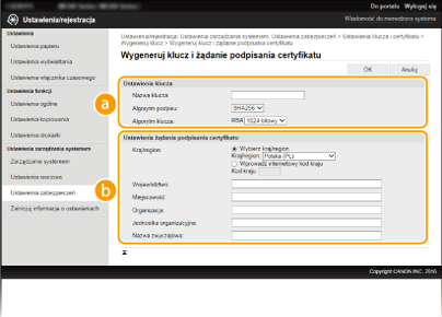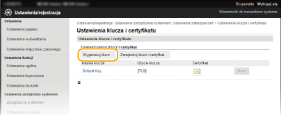 Parę kluczy można wygenerować za pomocą urządzenia, jeśli wymaga tego komunikacja szyfrowana z użyciem protokołu Transport Layer Security (TLS). Z szyfrowania TLS można korzystać podczas udzielania dostępu do urządzenia przez Zdalny interfejs użytkownika. Maksymalnie dla urządzenia można wygenerować pięć par kluczy (łącznie z parami fabrycznie zainstalowanymi). Wraz z parami kluczy wygenerowanymi dla „Komunikacja sieciowa” używane są certyfikaty z podpisem własnym. Wraz z „Klucz i żądanie podpisania certyfikatu” można wysłać wniosek o certyfikat cyfrowy wydany przez urząd certyfikacji dla pary kluczy wygenerowanej przez urządzenie.