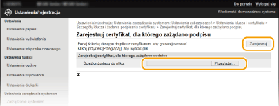 Kliknij przycisk [Przeglądaj], wybierz plik żądania podpisania certyfikatu, a następnie kliknij przycisk [Zarejestruj].