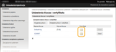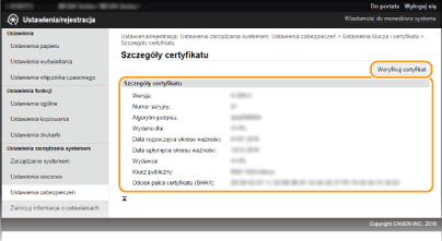 Kliknij [Ustawienia klucza i certyfikatu], aby zweryfikować parę kluczy lub [Ustawienia certyfikatu CA], aby zweryfikować certyfikat CA.