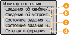 отображается экран, позволяющий проверять статус печатаемых или копируемых документов, а также состояние устройства (оставшееся количество тонера в картридже и т. п.), а также такие сведения о параметрах сети, как IP-адрес аппарата.