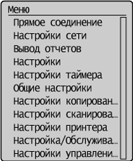 отображается экран <Меню>. На этом экране можно определять общие параметры компьютера, такие как <Настройки> или <Настройки таймера>, а также большинство параметров для каждой функции, такой как копирование или сканирование.