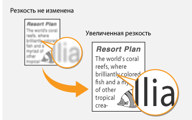Можно настроить резкость скопированного изображения. Можно увеличить резкость расплывчатого текста и строк или снизить ее для улучшения качества для фотографий, напечатанных в журнале.