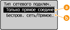 Автоматический выход из режима прямого соединенияМожно также настроить аппарат на автоматический выход из режима прямого соединения по истечении определенного периода времени после перехода аппарата в режим прямого соединения. Если параметр <Беспров. сеть/Прямое соед. (автоперекл.)> задан как метод соединения в режиме прямого соединения, аппарат автоматически подключается к беспроводной локальной сети после выхода из режима прямого соединения.