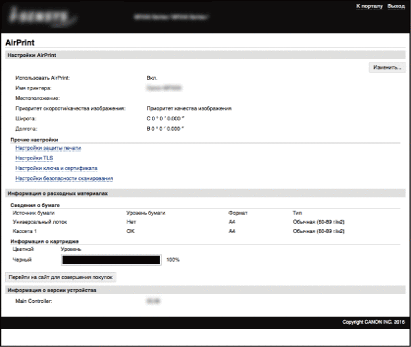 Можно отобразить экран AirPrint, с помощью которого можно не только получить доступ к параметрам AirPrint, но и просматривать информацию о расходных материалах, например бумаге и картридже с тонером. Кроме того, можно настраивать параметры функций безопасности (