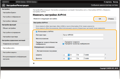 Можно зарегистрировать информацию, использующуюся для идентификации аппарата, например, имя аппарата и место его установки. Можно также отключить функцию AirPrint на аппарате. Для изменения этих параметров используйте Удаленный ИП.