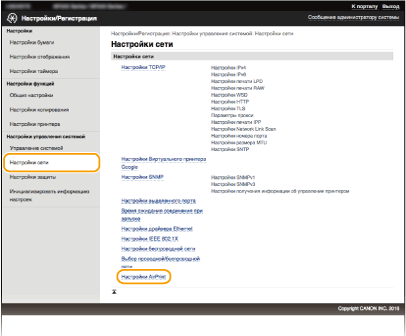 Можно указать, нужно ли выполнять печать с помощью AirPrint. Заводское значение по умолчанию — [Вкл.].