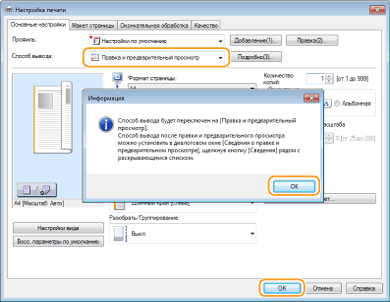 Выберите [Правка и предварительный просмотр] в [Способ вывода].