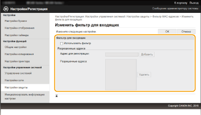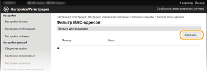 ![]() Проверка на наличие ошибок ввода При неправильном вводе MAC-адресов доступ к аппарату из Удаленного ИП может быть невозможен. В этом случае необходимо установить <Фильтр MAC-адресов> на <Выкл.>. Фильтр MAC-адресов