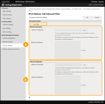 Якщо IP-адреси введено неправильно, доступ до апарата через Remote UI (Інтерфейс віддаленого користувача) може стати неможливим. У такому разі для параметра <IPv4 Address Filter> або <IPv6 Address Filter> потрібно вибрати значення <Off>. IPv4 Address Filter IPv6 Address Filter
