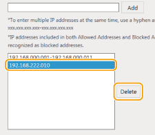 Видалення IP-адреси з винятків Виберіть IP-адресу та натисніть кнопку [Delete].