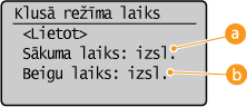 . Izmantojot šo darbību, varat vienkārši samazināt skaļumu iekārtas radītajām skaņām. Varat arī norādīt laiku, kad iekārtā automātiski ieslēgt kluso režīmu.