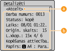 Tiek parādīta detalizēta informācija par kopiju skaitu, iestatījumiem u.c. Ja vēlaties tikai skatīt detalizētu informāciju bez kopēšanas atcelšanas, nospiediet