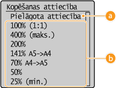 Varat palielināt vai samazināt kopiju izmēru, izmantojot iepriekš iestatītu kopēšanas koeficientu, piemēram, <A5->A4>, vai iestatot pielāgotu kopēšanas koeficientu ar 1% soli.
