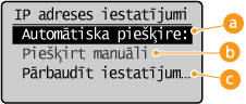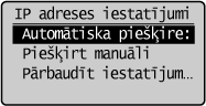 .![]() ![]() Ja nevēlaties izmantot DHCP/BOOTP/RARP, lai piešķirtu IP adresi Izvēlieties <Izsl.>. Ja izvēlaties <DHCP>, <BOOTP> vai <RARP>, kad šie pakalpojumi nav pieejami, iekārta tērēs laiku un sakaru, tos meklējot tīklā. |