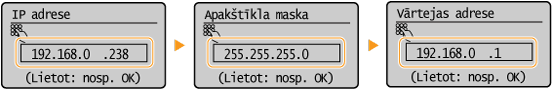 <Apakštīkla maska> <Vārtejas adrese>.Katrā ekrānā ievadiet iestatījumu, izmantojot ciparu taustiņus, un nospiediet