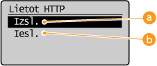 HTTP tiek izmantots sakariem tīklā, piemēram, lai piekļūtu iekārtai, izmantojot Remote UI (Attālais lietotāja interfeiss). Ja lietojat USB savienojumu, taču neizmantojat citas HTTP funkcijas, varat deaktivizēt HTTP, lai bloķētu ļaunprātīgu trešo personu piekļuvi, lietojot neizmantotu HTTP portu.