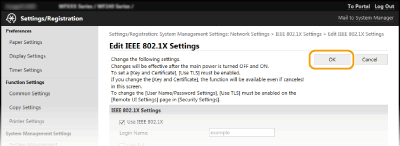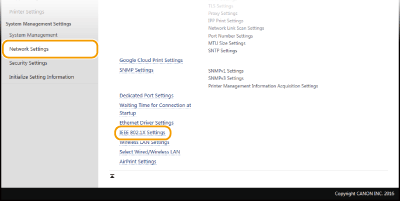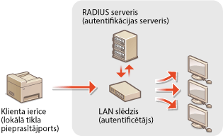 Iekārta var izveidot savienojumu ar 802.1X tīklu kā klienta ierīce. Standarta 802.1X tīkls sastāv no RADIUS servera (autentifikācijas serveris), LAN slēdža (autentificētājs) un klienta ierīcēm ar autentifikācijas programmatūru (lokālā tīkla pieprasītājportiem). Ja ierīce mēģina izveidot savienojumu ar 802.1X tīklu, ierīcei jāveic lietotāja autentifikācija, lai pārliecinātos, vai savienojumu veic autorizēts lietotājs. Autentifikācijas informācija tiek nosūtīta uz RADIUS serveri, kur tā tiek pārbaudīta. Šis serveris atļauj vai aizliedz sakarus ar tīklu atkarībā no autentifikācijas rezultāta. Ja autentifikācija neizdodas, LAN slēdzis (jeb piekļuves punkts) bloķē piekļuvi no tīkla ārpuses.