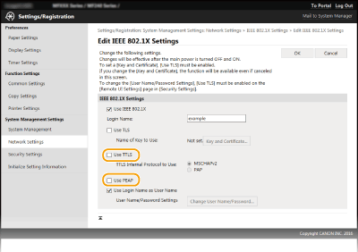 Nepieciešamie iestatījumi ir gandrīz tādi paši kā TTLS iestatījumi. MS-CHAPv2 tiek izmantots kā iekšējs protokols. Aktivizējiet utilītprogrammas Remote UI (Attālais lietotāja interfeiss) TLS pirms šīs autentifikācijas metodes konfigurēšanas (