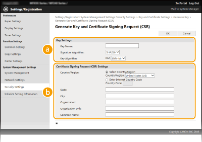 Iekārtā var ģenerēt atslēgu pāri, ja tas ir nepieciešams šifrētiem sakariem, izmantojot transporta slāņa drošību (TLS). TLS varat izmantot, ja iekārtai piekļūstat, izmantojot Remote UI (Attālais lietotāja interfeiss). Iekārtai var ģenerēt maks. piecus atslēgu pārus (iekaitot iepriekš instalētos). Pašparakstīti sertifikāti tiek izmantoti ar atslēgu pāriem, kas ģenerēti “Network Communication” (Tīkla saziņa). Izmantojot “Key and Certificate Signing Request (CSR)” (Atslēgu un sertifikātu parakstīšanas pieprasījums (CSR)), varat pieteikties CA izsniegtam digitālam sertifikātam iekārtas ģenerētam atslēgu pārim.