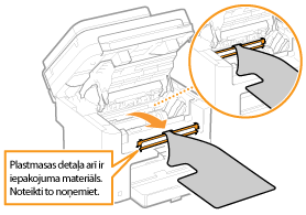 Uzmanīgi pavelciet papīru, kas atrodas starp fiksācijas daļu (