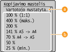 Galima padidinti arba sumažinti kopijas naudojant iš anksto nustatytą kopijavimo mastelį, pvz., <A5->A4>, arba nustatyti pasirinktinį kopijavimo mastelį 1 % žingsniais.