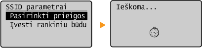 Galite ieškoti belaidžių maršrutizatorių (arba prieigos taškų), prie kurių galima prisijungti, ir pasirinkti vieną iš rodomų aparato ekrane. Kaip tinklo raktą įveskite WEP raktą arba TKIP. Prieš pasirinkdami belaidį maršrutizatorių, patikrinkite ir užsirašykite reikalingą sąrankos informaciją, įskaitant SSID ir tinklo raktą (