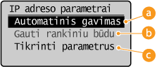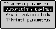 .![]() ![]() Jei nenorite naudoti DHCP / BOOTP / RARP protokolo IP adresui priskirti Pasirinkite <Išjungta>. Jei pasirinksite <DHCP>, <BOOTP> ar <RARP>, kai šių tarnybų nėra, aparatas gaiš laiką ir veltui naudos ryšio išteklius tinkle ieškodamas šių tarnybų. |