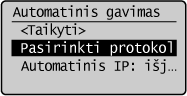 ![]() Jei rodoma <Įjungta>, pasirinkite <Automatinis gavimas> ir nustatykite, kad <Pasirinkti protokolą> ir <Automatinis IP> būtų nustatyta kaip <Išjungta>.