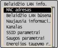 <Belaidžio LAN būsena> ir <Naujausia informacija apie klaidas> galima peržiūrėti iš