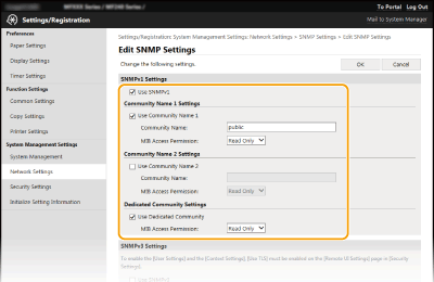 Paprastas tinklo valdymo protokolas (SNMP) – tai protokolas, skirtas tinklo ryšio įrenginiams stebėti ir valdyti naudojant valdymo informacijos bazę (MIB). Aparatas palaiko SNMPv1 ir didesnės saugos SNMPv3. Aparato būseną galite patikrinti kompiuteriu, kai spausdinate dokumentus ar naudojate priemonę „Remote UI“ (Nuotolinio vartotojo sąsaja). Galite įjungti SNMPv1 arba SNMPv3, arba abu vienu metu. Nurodykite kiekvienos versijos parametrus, kad atitiktų jūsų tinklo aplinką ir naudojimo paskirtį.