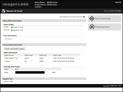 Galite atlikti visas priemonės „Remote UI“ (Nuotolinio vartotojo sąsaja) operacijas ir nurodyti visus parametrus. Įveskite tinkamą PIN kodą srityje [System Manager PIN] (