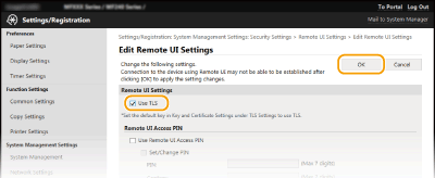 Įgalinkite priemonės „Remote UI“ (Nuotolinio vartotojo sąsaja) TLS.