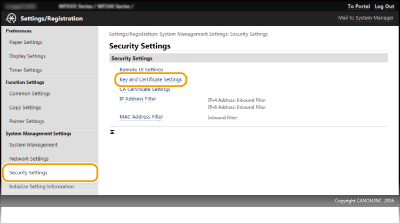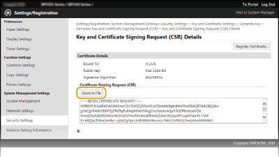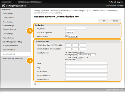 Raktų porą galima sugeneruoti naudojant aparatą, kai ji būtina užšifruotam ryšiui naudojant transportavimo lygmens saugą (TLS). Galite naudoti TLS pasiekdami aparatą naudodami priemonę „Remote UI“ (Nuotolinio vartotojo sąsaja). Aparate galima užregistruoti iki penkių raktų porų (įskaitant iš anksto įdiegtas poras). Su raktų poromis, generuotomis naudojant Network Communication, naudojami vartotojo pasirašyti sertifikatai. Naudojant Key and Certificate Signing Request (CSR) galima taikyti CA išduotus skaitmeninius sertifikatus aparato generuotai raktų porai.