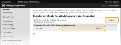 Spustelėkite [Browse], nurodykite sertifikato pasirašymo užklausos failą ir spustelėkite [Register].
