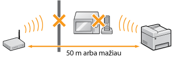 Ar tarp aparato ir belaidžio maršrutizatoriaus yra kokių nors kliūčių, pvz., sienų?