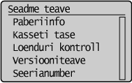 (Paberiseade), kuvatakse kuva <Paberiseaded>. Valige sellel kuval soovitud paber. Näiteks saate seda klahvi vajutades muuta paberiseadeid, kui asetate seadmesse paberiformaadi, mis erineb varem seadmes olnud paberiformaadist. Võtke arvesse, et paberiseade peab olema õigesti määratud, et paberi söötmisel poleks tõrkeid.