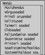 , siis kuvatakse kuva <Menüü>. Sellel kuval saate alustada seadme üldseadete (nt <Eelistused> või <Taimeri seaded>) ja iga funktsiooni (nt paljundamine või skannimine) paljude seadete määramist.