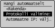 ![]() Kui kuvatakse olek <Sees>, valige <Hangi automaatselt> ja määrake funktsioonide <Protokolli valimine> ja <Automaatne IP> olekuks <Väljas>.