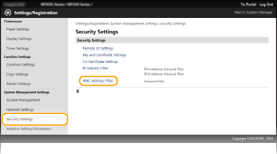 ![]() Veenduge, et poleks sisestusvigu Kui MAC-aadressid sisestatakse valesti, ei pruugi te Remote UI (Kaugkasutajaliides) kaudu seadmega juurdepääsu saada. Sel juhul peate seade <MAC-aadressi filter> olekuks määrama <Väljas>. MAC-aadressi filter