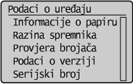 Prikazuje status uređaja, kao što su veličina papira ili količina preostalog tonera u spremnicima.