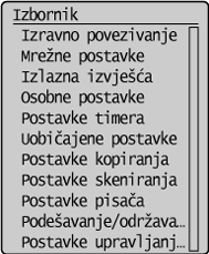 , prikazuje se zaslon <Izbornik>. Na tom zaslonu možete početi navoditi opće postavke uređaja, primjerice <Osobne postavke> ili <Postavke timera>, kao i brojne postavke svake funkcije, kao što su kopiranje i skeniranje.