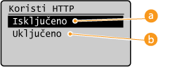 HTTP se koristi za komunikaciju putem mreže, primjerice prilikom pristupanja uređaju putem sučelja Remote UI (korisničko sučelje za daljinski pristup). Ako koristite USB vezu ili inače ne koristite HTTP, možete ga onemogućiti da biste blokirali zlonamjerne upade trećih osoba putem nekorištenog HTTP priključka.