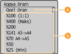<A5->A4> gibi önayarlı bir kopya oranını kullanarak veya %1'lik artışlarla özel bir kopyalama oranı ayarlayarak kopyaları büyütebilir ya da küçültebilirsiniz.
