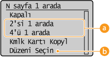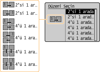 <2'si 1 arada>/<4'ü 1 arada> kullanılması kopya oranını otomatik olarak azaltır (kopya oranı ekranda gösterilir).